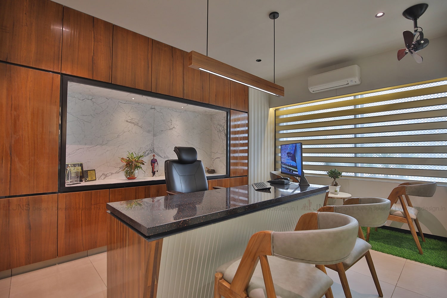 The MD’s cabin is a beautiful space with a sparkling desk and comfortable fancy chairs. The colour scheme used is a beautiful wood based theme.