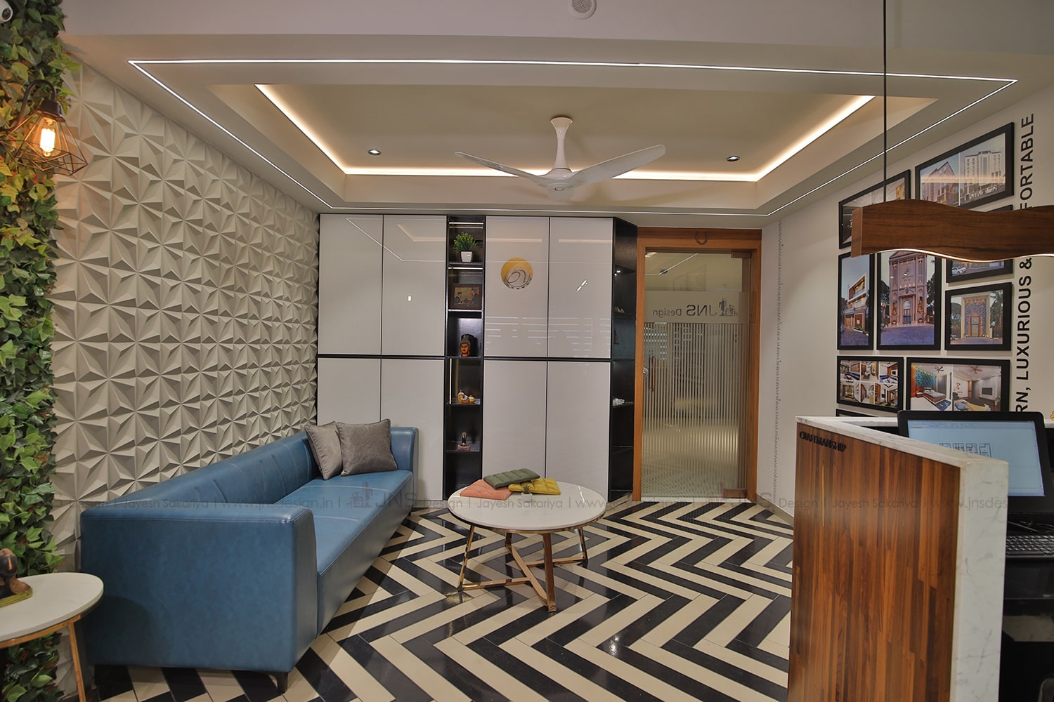 The space witnesses a bundle of materials and finishes. Upon the entrance there is a beautiful waiting area with a moulded wall and a blue waiting couch. One can find a beautiful luscious green wall at the side to add a cool tone to the entire space. The flooring works around the achromatic colour scheme in a herringbone pattern.