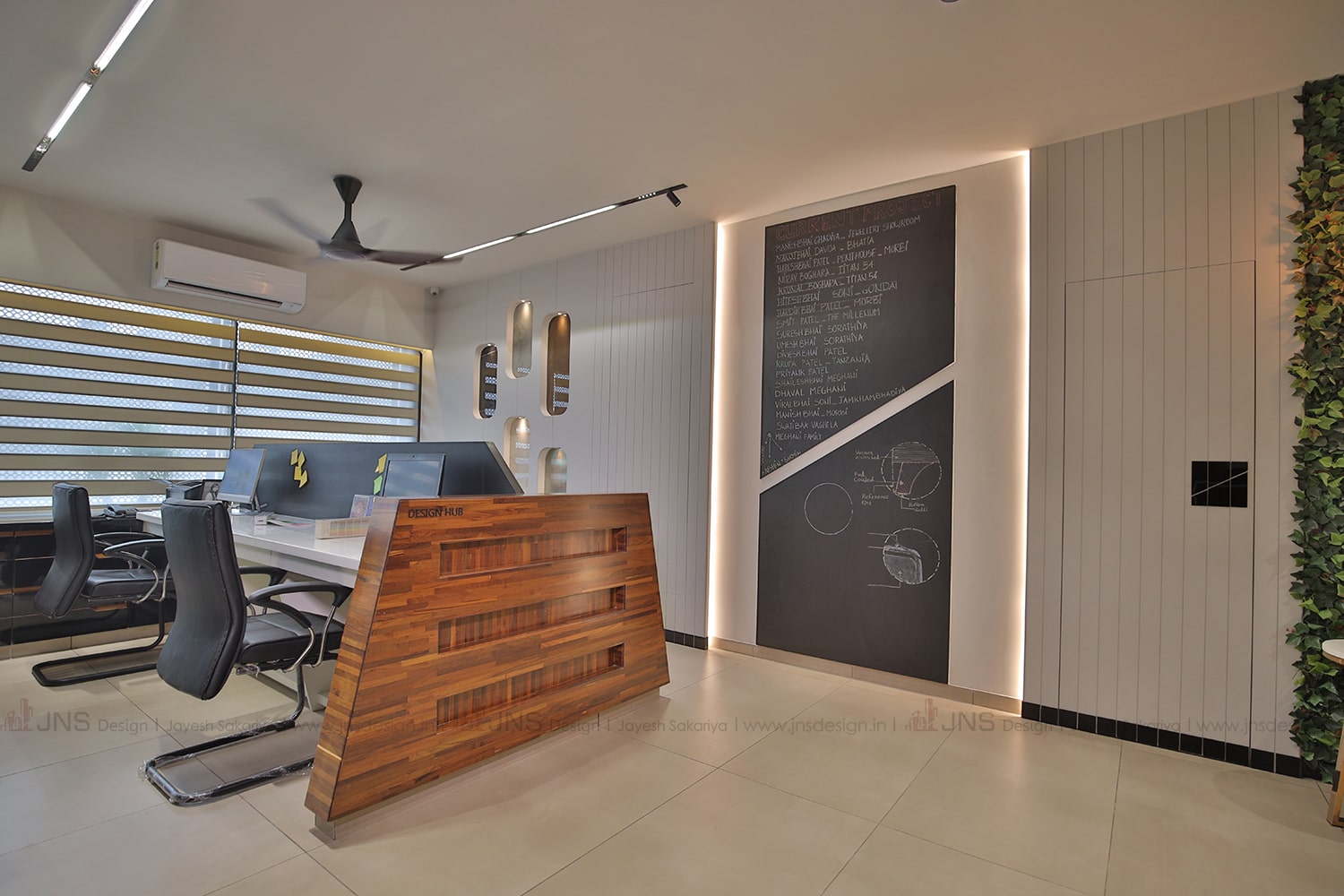 You can witness a black board decorated with all interior elements on it. There is a wooden partition to segregate the work space for the designers. The chairs used are comfortable for the designers convenience for the hard work they put in.